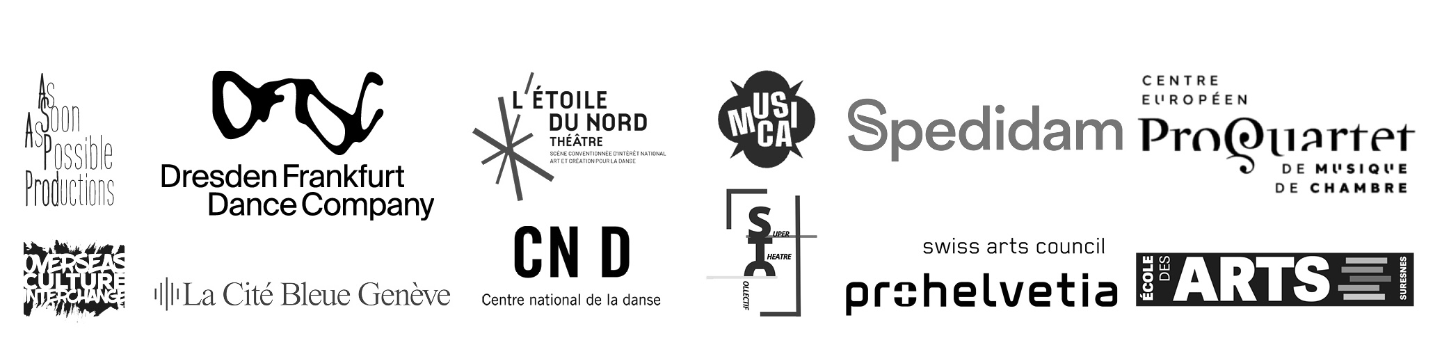 Une production As Soon As Possible (FR) et Overseas Culture Interchange (CH). En coproduction avec la DFDC - Dresden Frankfurt Dance Company et La Cité Bleue Genève. Avec le soutien de l’Etoile du Nord, de la Spedidam, du STC - Super Théâtre Collectif, du Musica Impulscentrum, de l’Ecole des Arts de Suresnes, de Pro Quartet - CEMC, de la Fondation Suisse pour la Culture Pro Helvetia et du CN D - Centre national de la danse (Pantin).